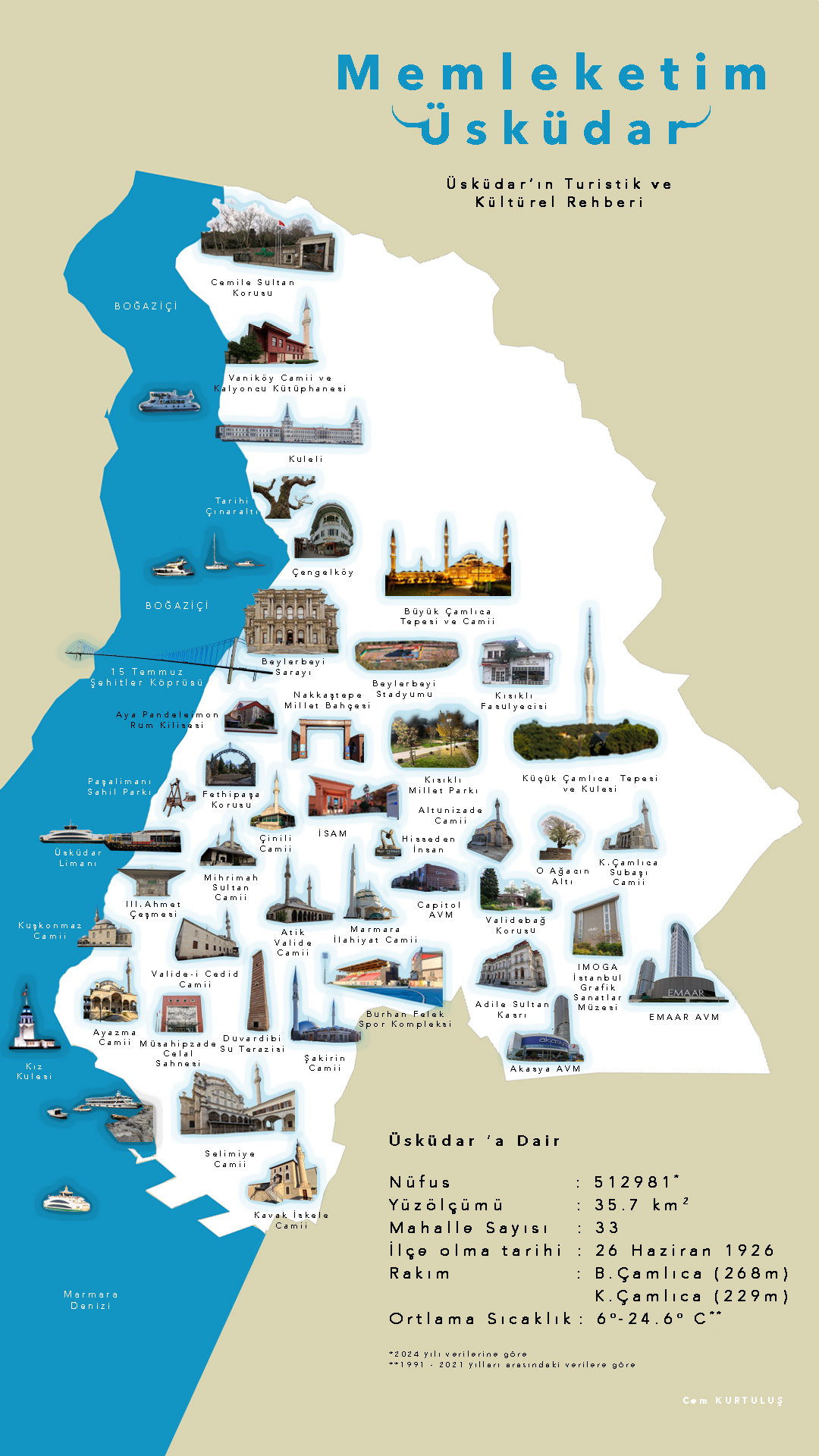 I created a tourist and cultural guide for Üsküdar, the district where I was born, raised, and now live for my Information Design final project in the Interactive Media Design master's program at Yıldız Technical University, Faculty of Social Sciences. This infographic maps Üsküdar's important tourist and cultural landmarks. It was impossible to fit all the historical and cultural centers, over 100 mosques and other places of worship, many libraries, dozens of parks and gardens, and numerous sports facilities of Üsküdar into my 1080x1920 pixel infographic. I tried to include only the places I considered important from my own perspective. I personally took photographs of each location and share this beautiful work that I've made a small revision after submitted the work to the school with you. The infographic has only Turkish language option right now.